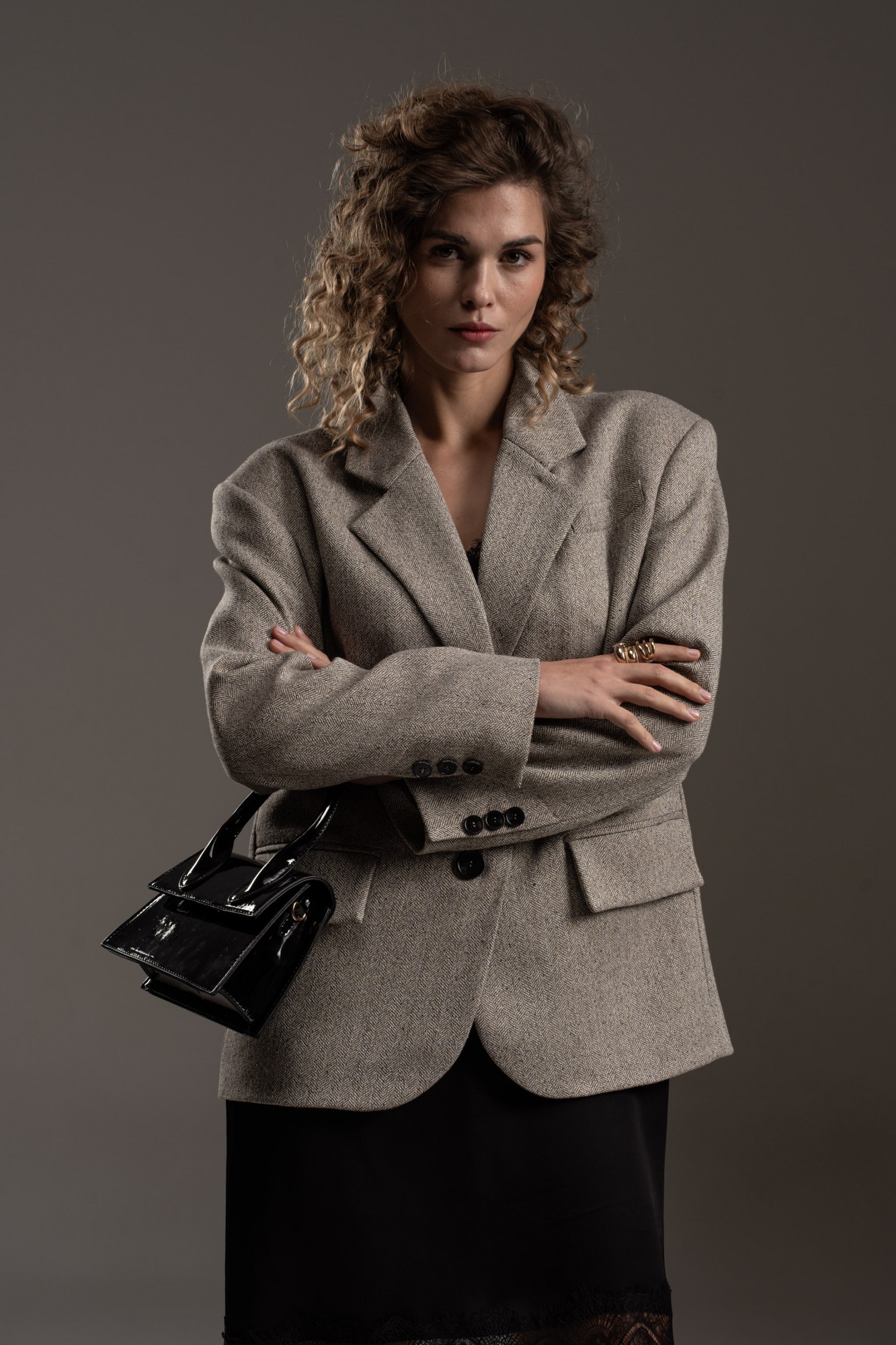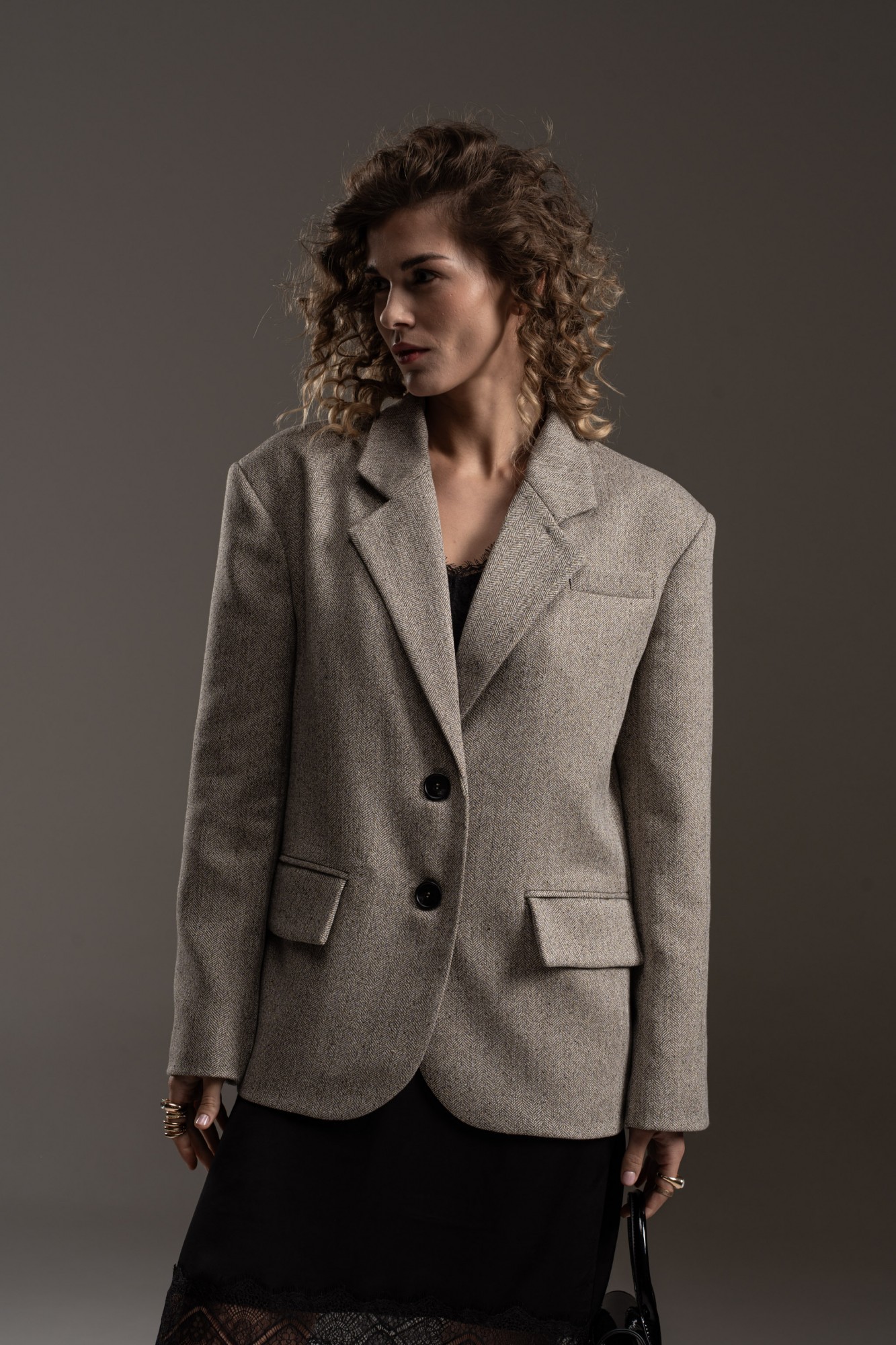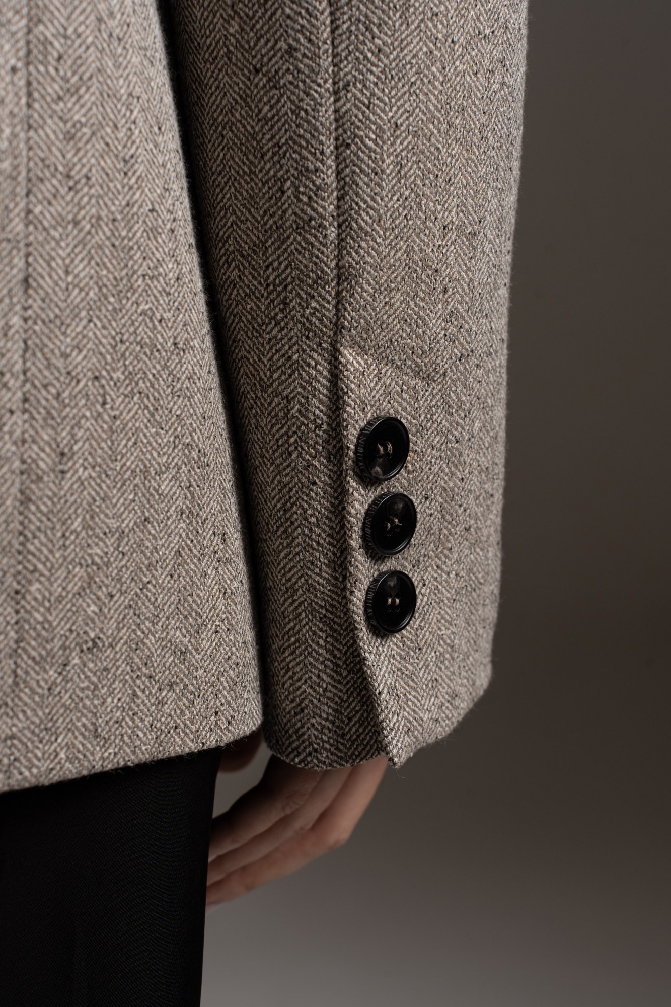 Жакет прямого силуэта, с увеличенной линией плеч, с отрезным бочком, на левой полочке листочка. Жакет на поливискозной подкладке. Спереди прорезные карманы с клапаном. Спинка со средним швом, отрезным бочком. Воротник пиджачного типа с отложным лацканом. Рукав втачной, двухшовный, со шлицей и пуговицами.