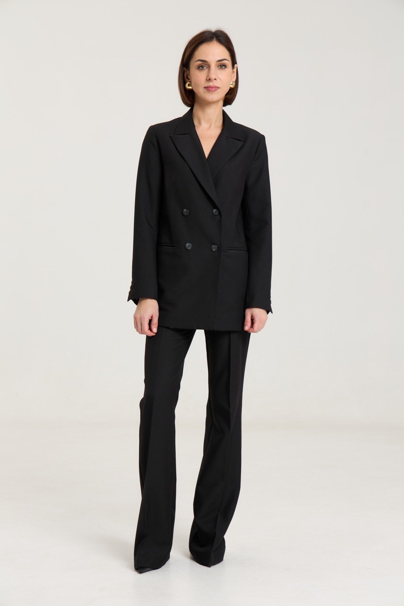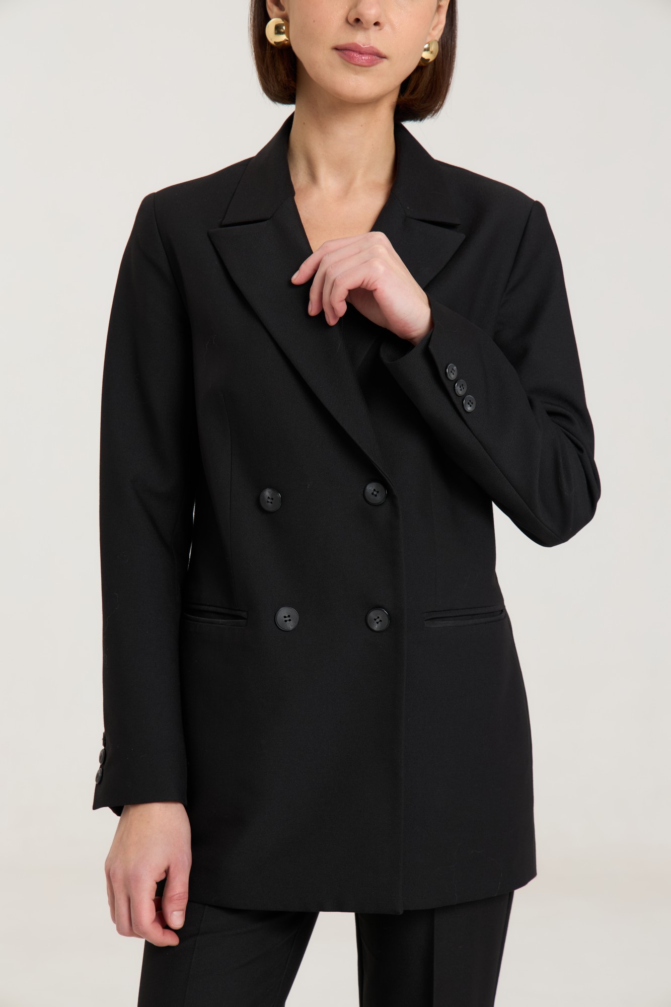 Жакет пошит таким образом, чтобы в нем было комфортно женщине любого возраста, с любыми формами. Жакет двубортный, с нагрудными выточками, прорезные карманы в рамку с клапанами, застежка на петли и пуговицы, спинка со средним швом, втачные двухшовные рукава, с тремя отделочными пуговицами, жакет на подкладке. Выполнен из премиальной ткани костюмной группы.