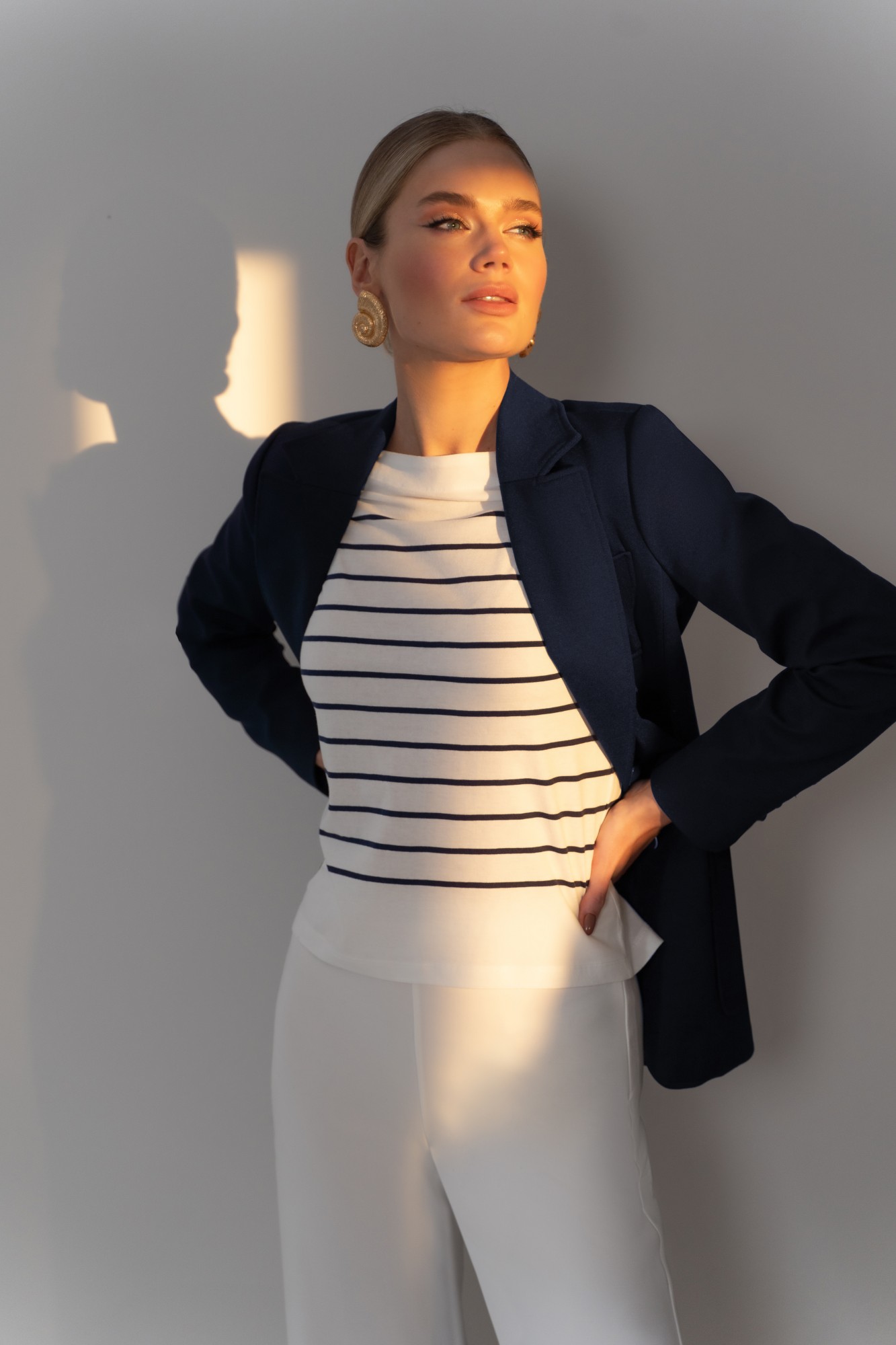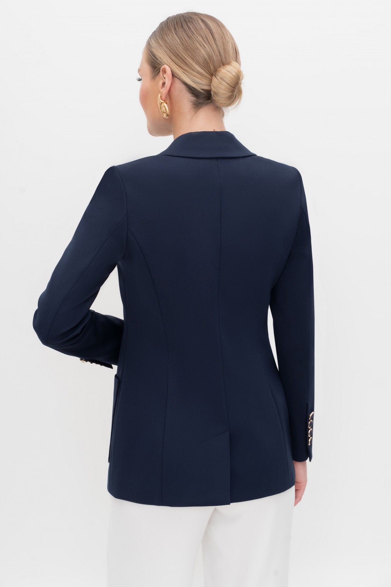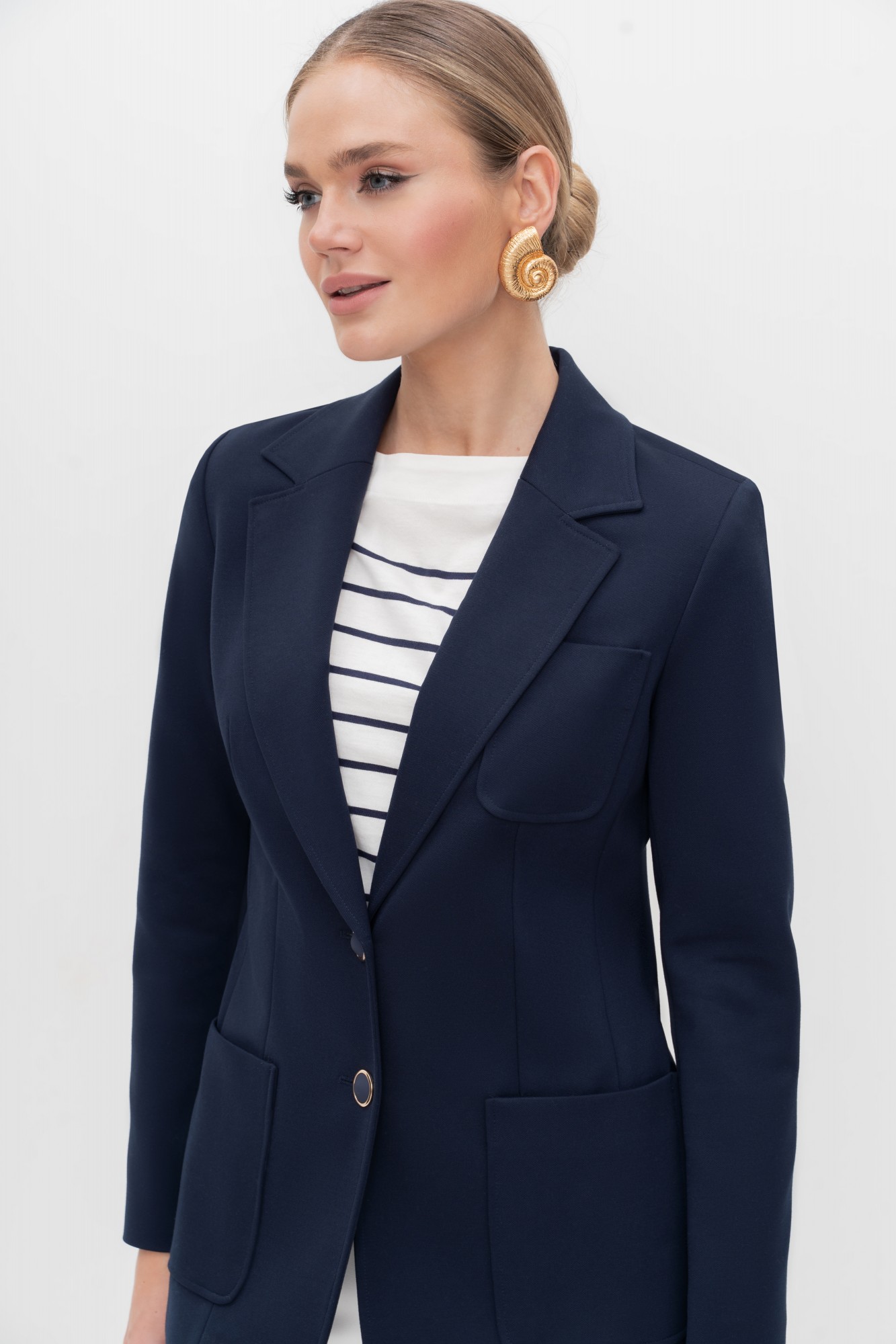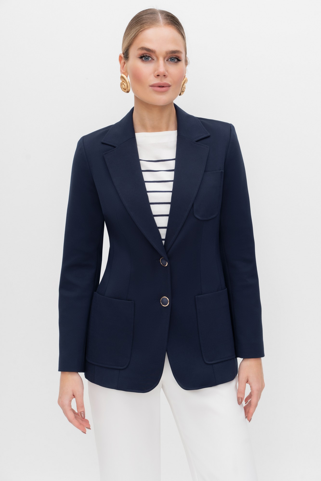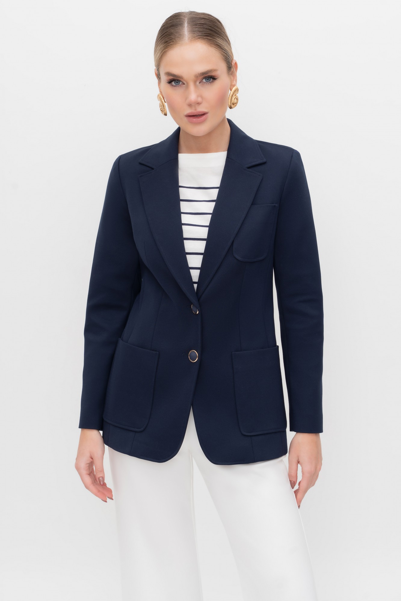 Синий жакет – это воплощение элегантности и утонченного стиля. Его классический крой и насыщенный цвет делают его идеальным выбором для создания как деловых, так и повседневных образов. Он прекрасно сочетается с различными элементами гардероба, такими как юбки, брюки и платья, добавляя нотку изысканности и шарма. Изготовленный из качественной ткани, жакет обеспечит комфорт и долговечность, оставаясь актуальным трендом на протяжении многих сезонов. Жакет женский полуприлегающего силуэта на подкладке. Жакет предназначен для повседневной носки. Перед жакета с центральной бортовой застежкой на 2 петли и пуговицы (фурнитура может незначительно отличаться от фото). По переду идет полурельеф от низа до центра груди и вертикальные рельефные швы, выходящие из проймы до низа жакета. В нижней части переда - настрочные карманы с закругленными углами. На правой стороне переда вверху накладной карман. Края борта закругленные. По краю борта, лацканам, отлету воротника и карманам идет отделочная строчка. Спинка жакета со средним швом со шлицей и вертикальными рельефными швами, выходящими из проймы и идущими до низа. Рукава втачные двухшовные длинные, по низу локтевого шва обработана шлица, застегивается на 4 петли и пуговицы. Плечевой пояс оформлен плечевыми накладками. Длина жакета по среднему шву спинки – 69,0 см (±3,0 см), Длина рукава жакета – 62,0 см (±2,0 см),