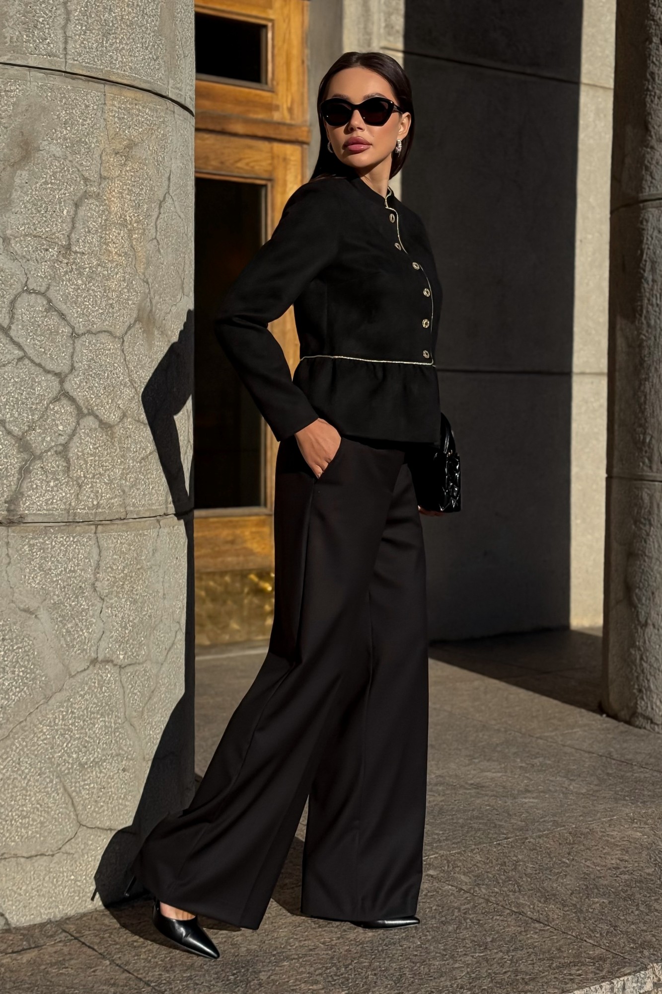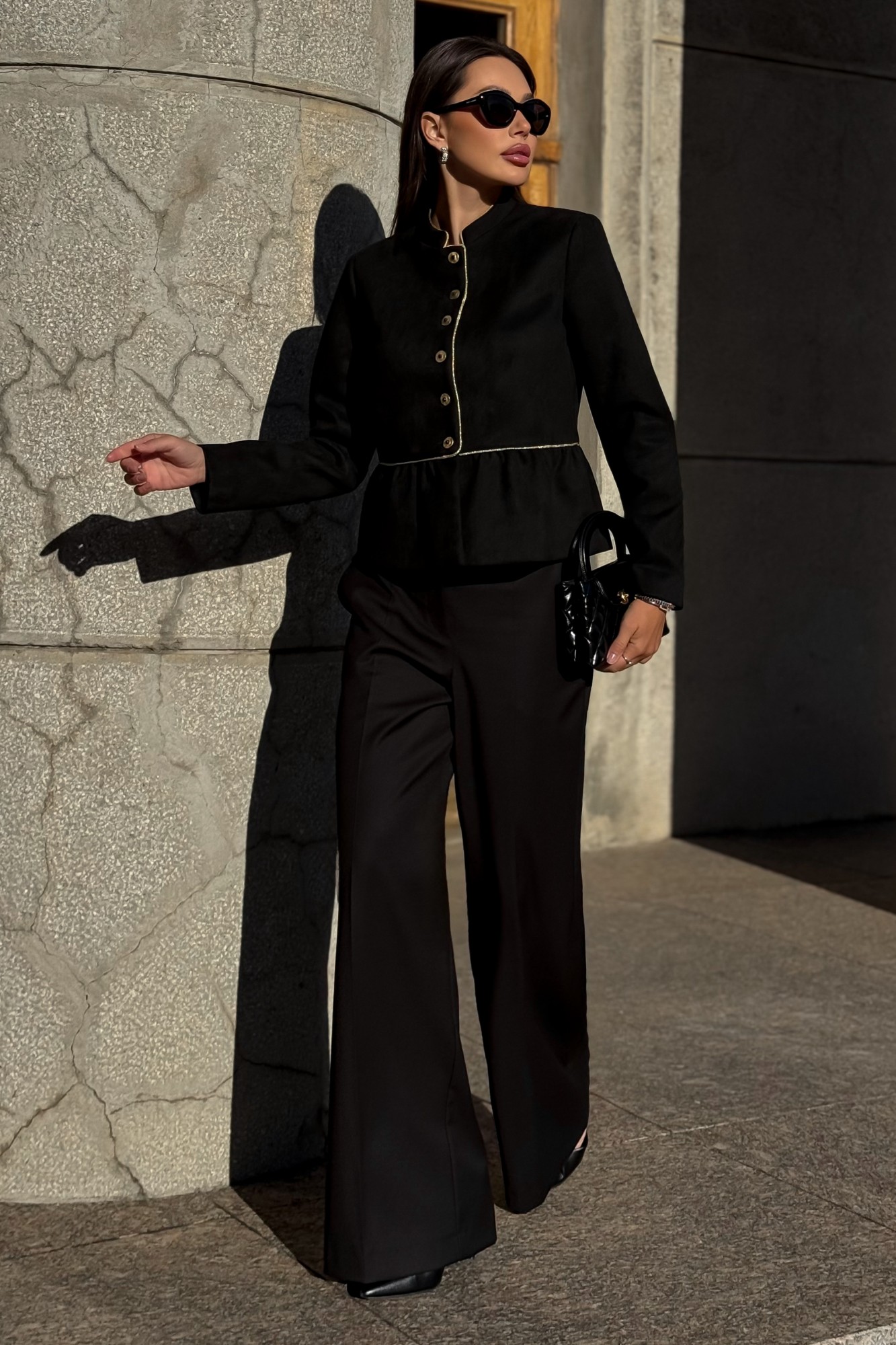 Женский чёрный замшевый жакет URS — воплощение элегантности, уверенности и изысканного вкуса. Эта модель создана для женщин, которые ценят стиль, комфорт и внимание к деталям. Жакет женский, нарядный, полуприлегающего силуэта из мягкой искусственной замши на трикотажной основе, отрезной по линии талии, с центральной бортовой застежкой от шва талии до верха на 6 петель и 6 пуговиц (размер и цвет фурнитуры может незначительно отличаться от фото). Верхняя часть переда с нагрудными вытачками от боковых швов. Верхняя часть спинки с рельефными швами, идущими от пройм вниз до шва талии. Нижняя часть переда и спинки двойная, со сгибом, со сборкой по шву талии. Верхняя часть переда и спинки, рукава на подкладке. Горловина оформлена воротником-стойкой. Рукава втачные, двухшовные, длинные. Воротник, борта, шов талии переда и спинки оформлен декоративной тесьмой. Жакет с плечевыми накладками.