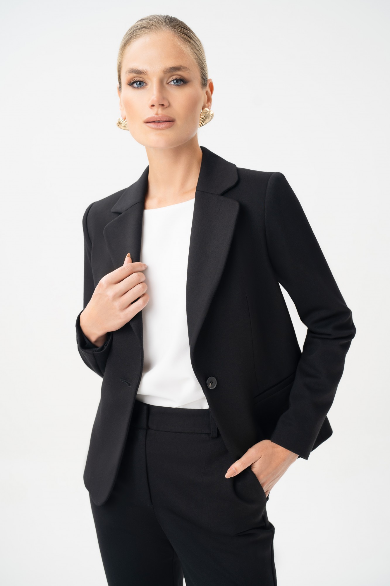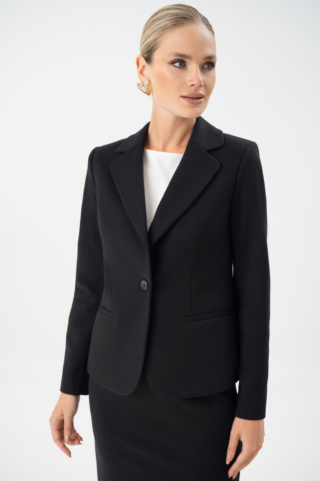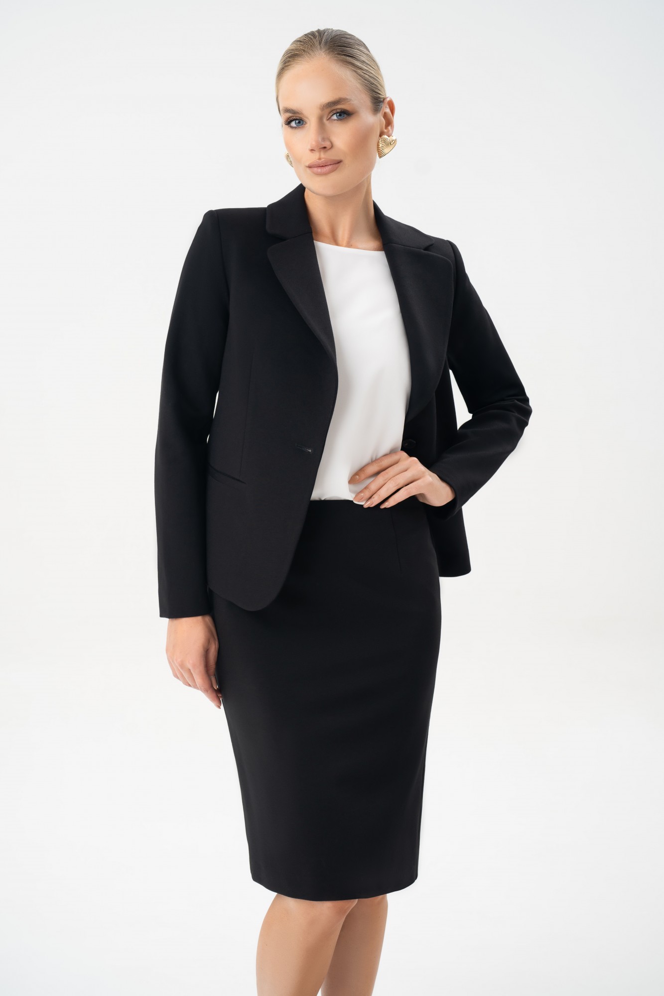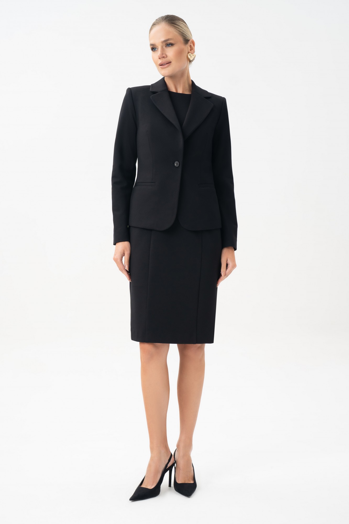 Черный трикотажный жакет – незаменимая вещь на каждый день. Эта модель универсальная, она подойдет любой женщине, независимо от её возраста, предпочитаемого стиля одежды и телосложения. Такую популярность жакет черного цвета приобрел за счет своей уникальной комбинаторности, он легко сочетается с массой вещей. Кроме того, такая модель уместна в любой ситуации. Жакет прекрасно комбинируется с блузой 24-425-1 и является комплектом к брюкам 25-549-1, юбке 25-550-1, платью 25-561-1. Жакет женский полуприлегающего силуэта, выполнен из трикотажного полотна, на подкладке, с воротником пиджачного типа, предназначен для повседневной носки. Перед и спинка с отрезным бочком. Перед жакета с центральной бортовой застежкой на 1 петлю и пуговицу (размер и цвет фурнитуры может незначительно отличаться от фото), с закругленными по низу бортами, с рельефными швами бочка, в нижней части с прорезными функциональными карманами с листочками, с вытачками, идущими от карманов вверх. Спинка со средним швом, с рельефными швами бочка. Рукава втачные, двухшовные, длинные. Концы воротника и лацканов закругленные. Жакет с плечевыми накладками.
