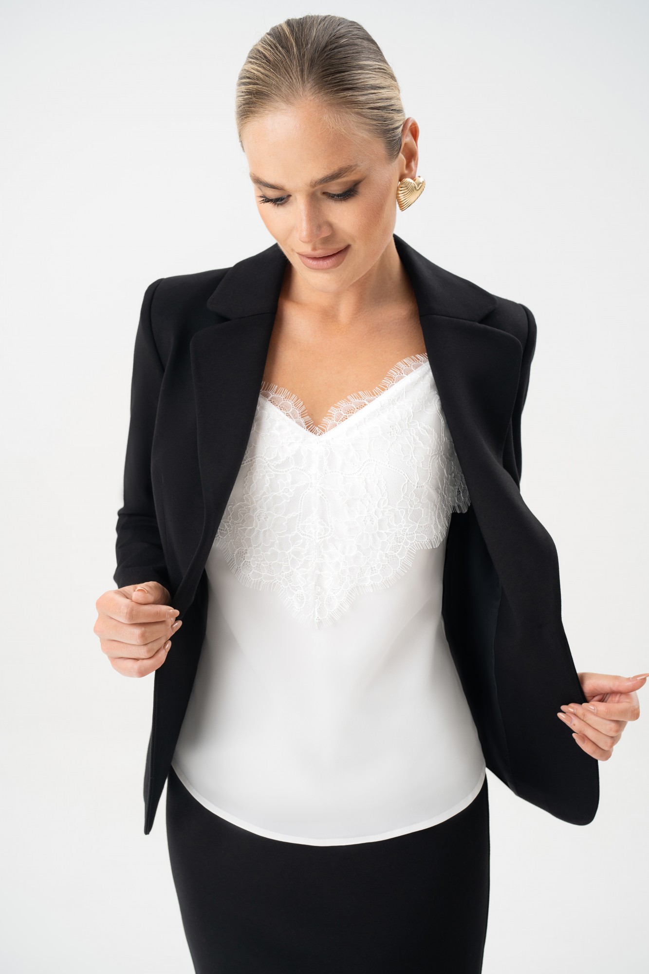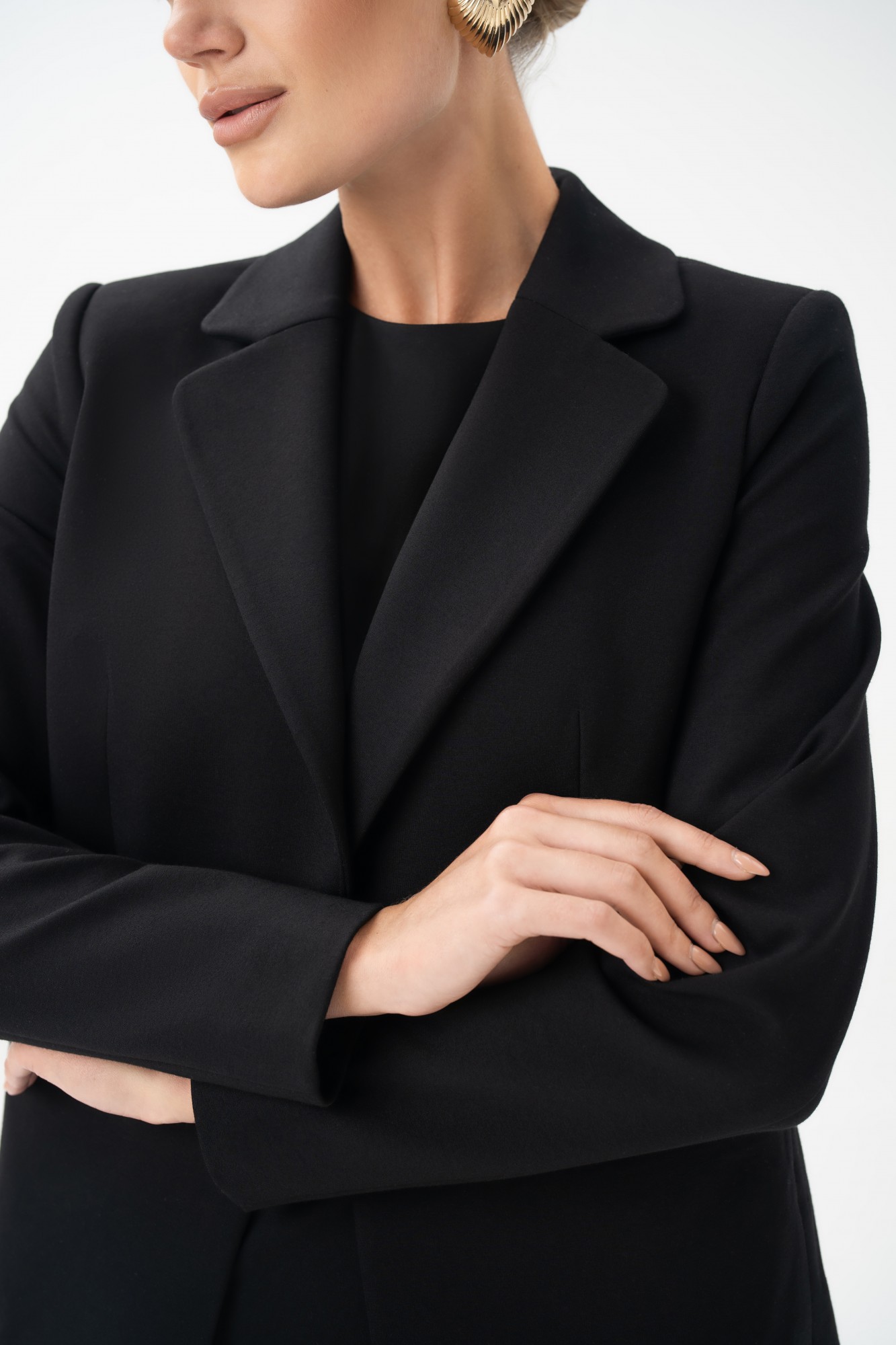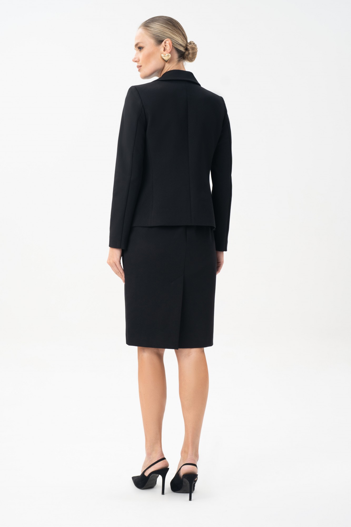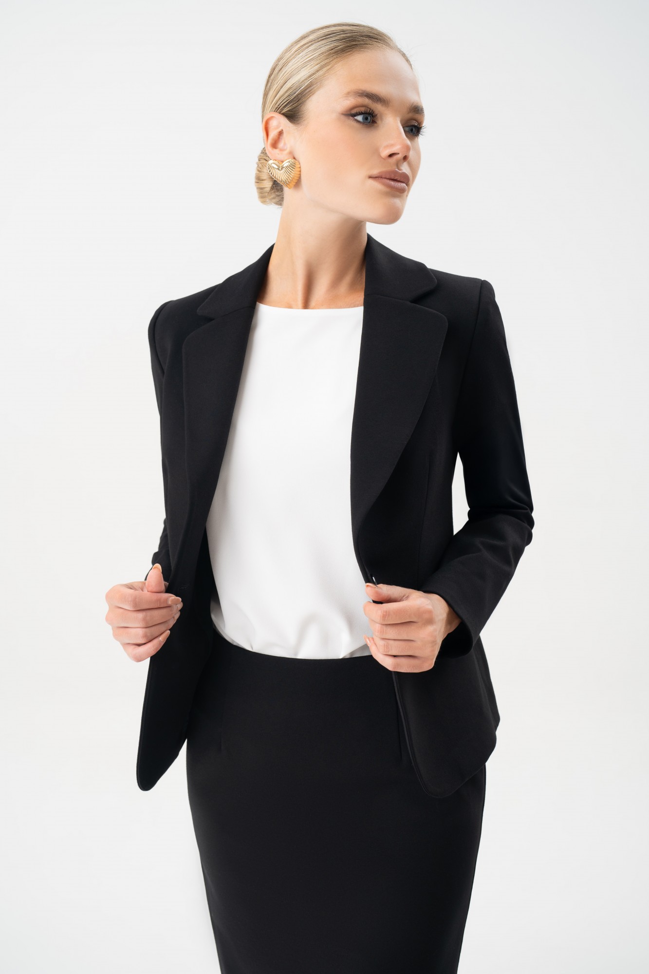 Черный трикотажный жакет – незаменимая вещь на каждый день. Эта модель универсальная, она подойдет любой женщине, независимо от её возраста, предпочитаемого стиля одежды и телосложения. Такую популярность жакет черного цвета приобрел за счет своей уникальной комбинаторности, он легко сочетается с массой вещей. Кроме того, такая модель уместна в любой ситуации. Жакет прекрасно комбинируется с блузой 24-425-1 и является комплектом к брюкам 25-549-1, юбке 25-550-1, платью 25-561-1. Жакет женский полуприлегающего силуэта, выполнен из трикотажного полотна, на подкладке, с воротником пиджачного типа, предназначен для повседневной носки. Перед и спинка с отрезным бочком. Перед жакета с центральной бортовой застежкой на 1 петлю и пуговицу (размер и цвет фурнитуры может незначительно отличаться от фото), с закругленными по низу бортами, с рельефными швами бочка, в нижней части с прорезными функциональными карманами с листочками, с вытачками, идущими от карманов вверх. Спинка со средним швом, с рельефными швами бочка. Рукава втачные, двухшовные, длинные. Концы воротника и лацканов закругленные. Жакет с плечевыми накладками.
