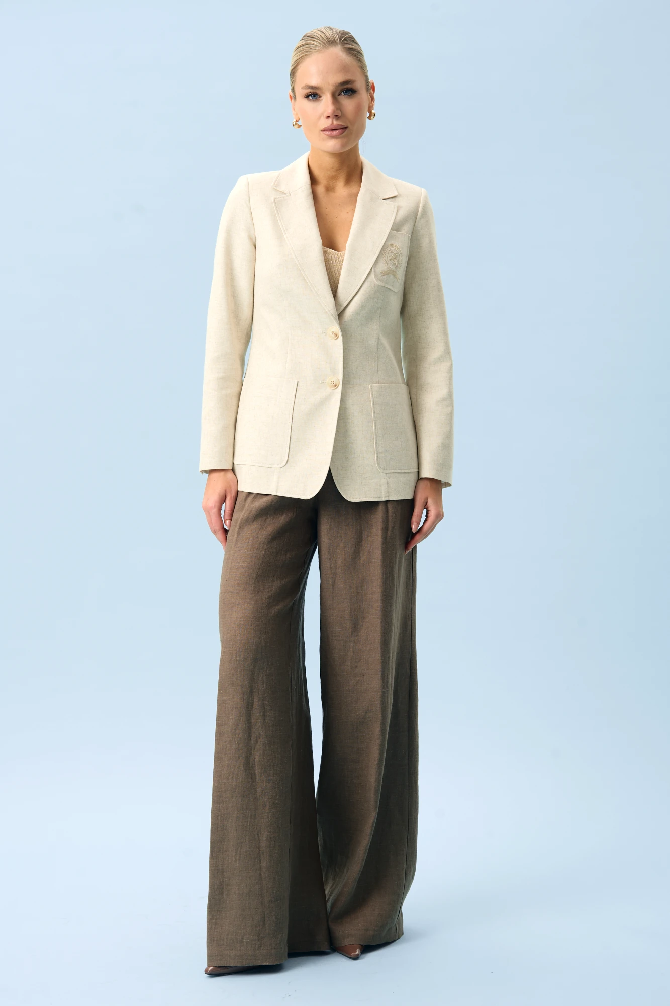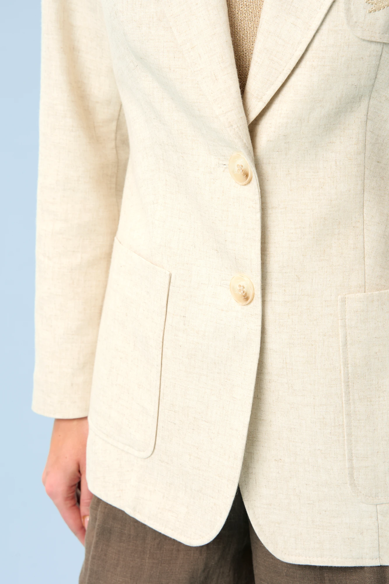 Льняной пиджак женский с вышивкой URS в натуральном светло-бежевом оттенке - та самая вещь, которая собирает образ за минуту. Это пиджак женский льняной летний для офиса, города, прогулки и гардероба в стиле old money: выглядит благородно, ощущается легко и не спорит с любимыми брюками, платьями или джинсами. Жакет женский ЮРС полуприлегающего силуэта, выполнен из костюмной льняной ткани, на подкладке, с воротником пиджачного типа, предназначен для повседневной носки. Перед жакета с центральной бортовой застежкой на 2 петли и 2 пуговицы (фурнитура может незначительно отличаться от фото), с закругленными по низу бортами. Перед с полурельефами, идущими от низа до центра груди, с рельефными швами, от пройм до низа. Нижняя часть переда с накладными карманами закругленной формы, верхняя левая часть переда с накладным карманом закругленной формы, карман с декоративной вышивкой. Спинка с рельефными швами, и средним швом со шлицей. Рукава втачные двухшовные длинные, по низу локтевые швы со шлицей, застегивающиеся на 4 петли и 4 пуговицы. По краю борта, лацканам, воротнику, карманам прострочена отделочная строчка шириной 0,5см. Жакет с плечевыми накладками.